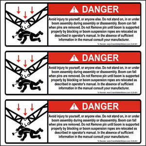 DANGER Avoid injury to yourself, or anyone else. Do not stand on, in, or under boom assembly during assembly or disassembly. The boom can fall when pins are removed. Do not remove the pin until the boom is supported properly by blocking or boom suspension ropes are relocated as described in the operator's manual. In the absence of sufficient information in the manual consult your manufacturer.