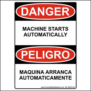 This DANGER Machine Starts Automatically, PELIGRO maquina arranca automaticamente Safety Sticker size is 3.5 inches wide by 5 inches tall and 5 inches wide by 7 inches tall.