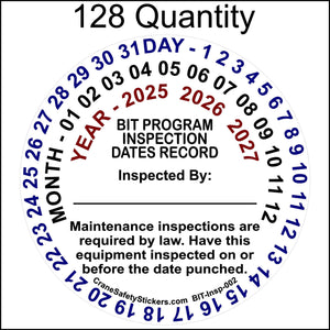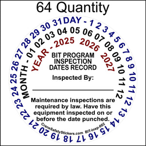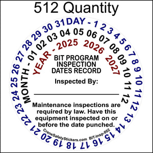 Each Bit Inspection sticker is printed with all 12 months, 31` days, and 3 consecutive years. This allows the inspector to use a hole punch to select the date for the next bit inspection.