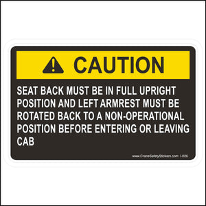 Seat Back Must Be In a Full Upright Position and the left armrest must be rotated back to a non-operational position before entering or leaving the cab.