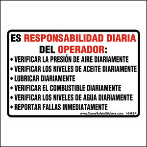 Spanish It Is the Operator's Daily Responsibility Sticker size 3 inches tall by 4 1/2 inches wide.