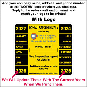 No Design charges to add your company name and or logo to the inspection certificates. Contact us by phone at 419-677-5035 to add your name or logo. We will add your information to this design and email or text message you an artwork proof before we print your custom inspection stickers. Normally we have fast turnaround times on our custom stickers of 1 to 2 days.