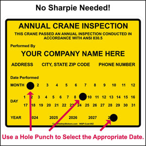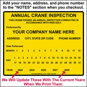Custom crane annual inspection stickers size is 4 inches tall by 5 inches wide.