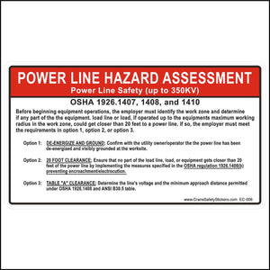 350 KV OSHA Hazard Assessment 1926.1407 OSHA 1926.1408 OSHA 1926.1410 Power Line Hazard Assessment Sticker is 9 inches wide by 5 inches tall.