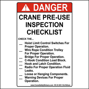 This crane pre-use inspection checklist sticker is a perfect reminder for the crane operator to check all the OSHA-required parts of the crane. This helps ensure a safe work environment and keeps your crane in good, working order.