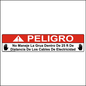 This sticker size is 5 inches tall by 23 1/2 inches wide. It is printed with, Danger Do Not Operate Boom Within 25 ft. of Electrical Cables in Spanish. This Electrical Warning sticker can be placed on both sides of your boom.