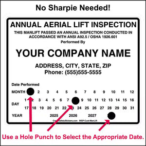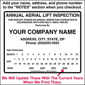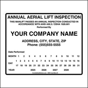 Custom Man Lift annual inspection stickers are 4 inches tall by 5 inches wide.