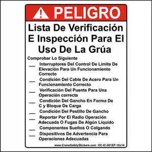 Our Spanish Overhead Crane Pre-Use Inspection Checklist Stickers are created, printed, cut, and shipped in the USA.