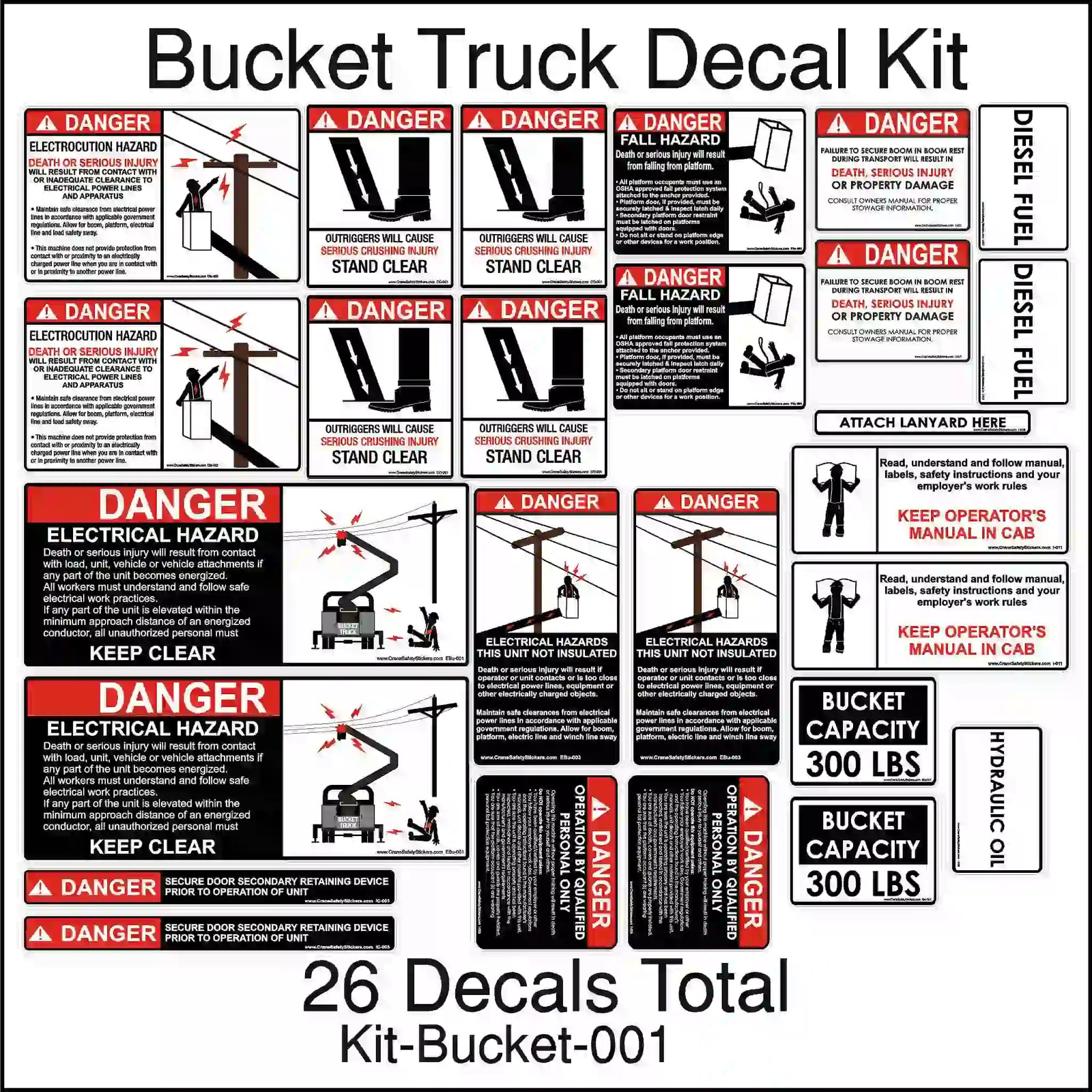 Crane safety sticker kits and crane safety decal kits include crush hazards, electrical hazards, fall hazards, crush hazards, crane hand signals, fire, two blocking, diesel fuel, and more.