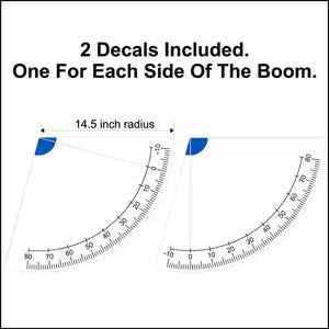 These crane angle indicator decals are printed with angles from -10 degrees to 80 degrees. Each decal has a light grey 90-degree placement line for reference to make installation quick and easy. The Blue portion is removable and made to be discarded when applying the decal to the crane boom.
