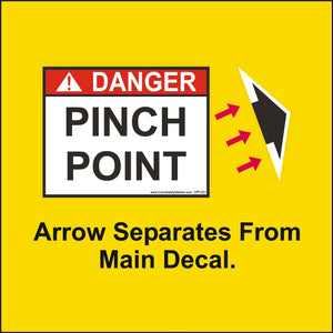 DANGER Pinch Point. A separate sticker is printed with an arrow to point directly toward the place where the two machine edges come together or a body part can be crushed or pinched.