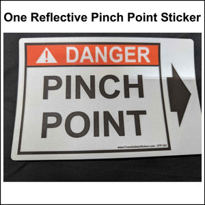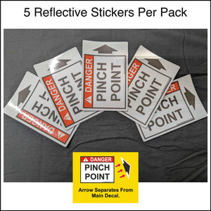 LARGE Reflective DANGER PINCH POINT Sticker size is 4 3/4 inches wide by 3 3/4 inches tall.